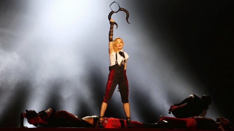 Докато звездата се опитваше да развърже връзката на огромното си черно наметало, танцьор от трупата й дръпна рязко мантията и събори Мадона на земята (вижте още снимки в галерията).