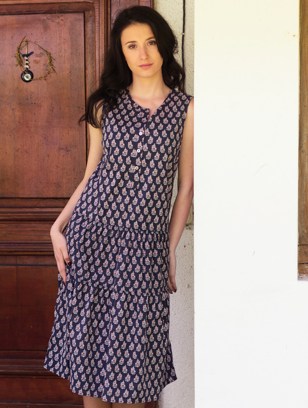 Последно, но не и по важност, отдаваме заслужено внимание на тази рокля - елегантна и същевременно непретенциозна, вдъхновена от разбирането, че красотата е в простотата. Цялата рокля е покрита с дребни и деликатни цветчета. Материята е лека и оставя усещане за комфорт дори в най-горещата част от деня.
