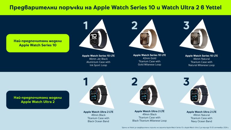 35% повече поръчки са отчетени и при смарт часовниците Apple Watch Series 10 спрямо миналогодишната серия Watch Series 9. Най-поръчваният модел за тази година е Apple Watch Series 10 LTE 46mm Jet Black Aluminium Case със Ink Sport Loop, докато от Ultra варианта най-търсен е Apple Watch Ultra 2 LTE 49mm Black Titanium Case със Black Ocean Band. Yettel е единственият оператор в страната, който предлага новите смарт часовници на Apple, както и multiSIM услугата, която работи с LTE вариантите им.