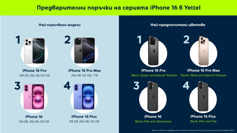 15% ръст в заявките за серията новите модели iPhone - 16, 16 Plus, 16 Pro и 16 Pro Max - спрямо същия период миналата година и серията iPhone 15 отчита Yettel след края на предварителните поръчки преди старта на официалните продажби (13-20 септември). Тази година най-търсен е iPhone 16 Pro, като той е предпочитан основно в цветовете Black Titanium, Desert Titanium и Natural Titanium.