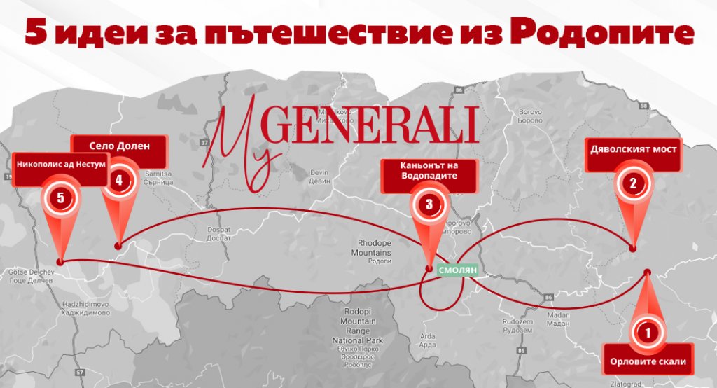 Ето защо от Webcafe и #MyGenerali ви предлагаме 5 любопитни места из Родопите, достъпни с едно бързо пътешествие с кола. То може да ви отнеме ден или няколко, в зависимост от това как разпределите времето си, кои места искате да посетите и дали ще решите да нощувате в отправната точка - град Смолян.*