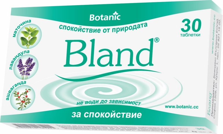 Бланд (Bland) е комбинация от висококачествени стандартизирани екстракти с научно доказано благоприятно действие при състояния на стрес и безпокойство. Съдържащите се в него маточина и лавандула действат благоприятно на нервната система и сърцето, а ашвагандата успокоява. Бланд е продукт на билкова основа, подходящ дори и за деца.