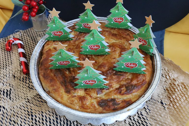 Разпределяме късметите в баницата и паричката и продължаваме да редуваме яйце и сирене и намачкани кори, докато остане една последна кора. Нея отново слагаме, без да я мачкаме. Нарязваме суровата баница на осем парчета.