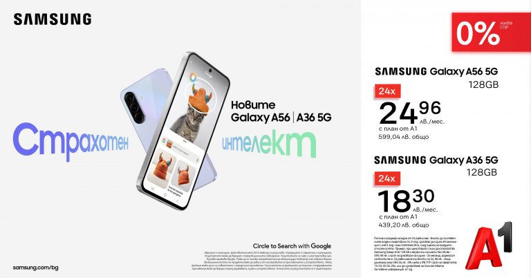 А1 обяви старта на продажбите на най-новите модели от популярната Galaxy A серия на Samsung - Samsung Galaxy A26 5G, Samsung Galaxy A36 5G и Samsung Galaxy A56 5G. До 30 април всички устройства могат да бъдат закупени с 0% лихва на лизинг за 24 месеца с план Unlimited и в комплект с безжични слушалки ttec Mode.