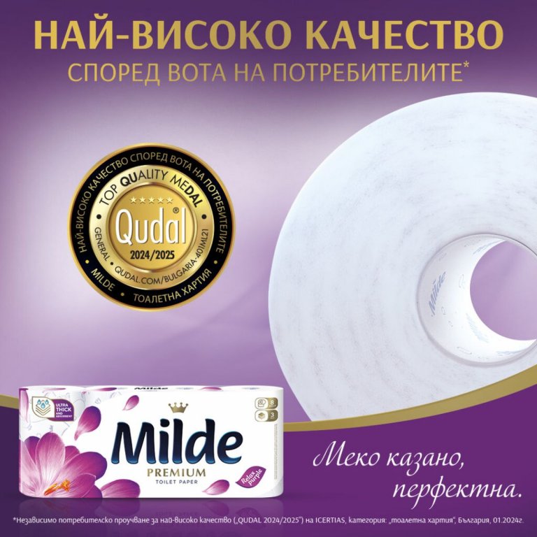 Да вземем за пример тоалетната хартия. При нея можем спокойно да се доверим на абсолютното качество, гарантирано от медала QUDAL на ICERTIAS, чийто носител за 2024/2025 г. е марката Milde.