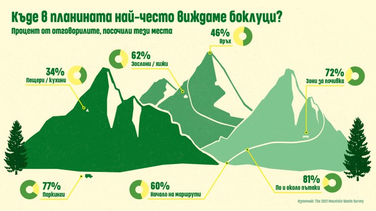 Пластмасовите опаковки са най-често срещаните отпадъци в планините в световен мащаб, сочи проучването "Пластмаса на върха" (2021 Global Mountain Waste Survey*). Преобладаваща част от анкетираните споделят, че виждат отпадъци при всяко посещение в планината.