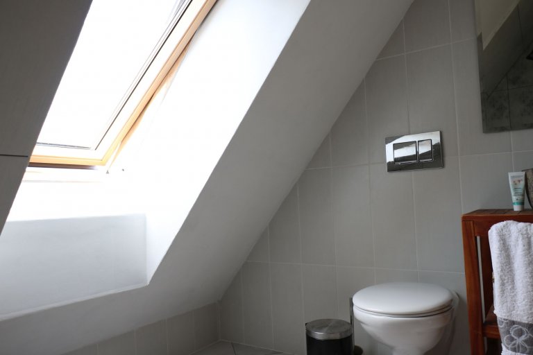 Банята в съседство също е снабдена с покривен прозорец, от който се открива прекрасна гледка към София. Освен светлината и красотата, които този прозорец вкарват в помещението, той създава и усещането за простор в иначе малката като площ баня. Допълнителният визуален обем, който той добавя, компенсира силното скосяване на външната стена и създава усещане за достатъчно пространство.