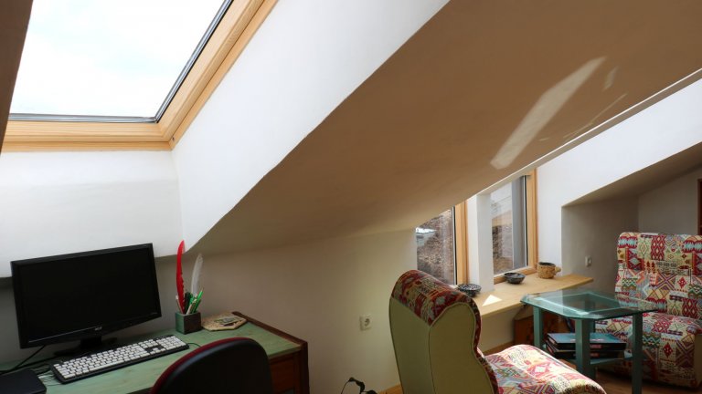 В обособения на втория етаж кабинет са монтирани общо 3 покривни прозореца с горно управление. Два от тях са допълнени с вертикални прозорци VELUX, оформяйки по този начин светъл и уютен кът за работа, за отмора с чаша кафе и хубава книга или просто за мигове в съзерцание на красивата природата наоколо. "За мен добавянето на двата вертикални елемента към покривните беше много важно - елемент, на който силно държах - обяснява собственичката. - От тези прозорци се разкрива уникална гледка към Витоша. Обожавам да седя там, да работя или почивам, наслаждавайки се на изключителната панорама, която се открива пред мен. Това е кътчето в къщата, което обожавам."