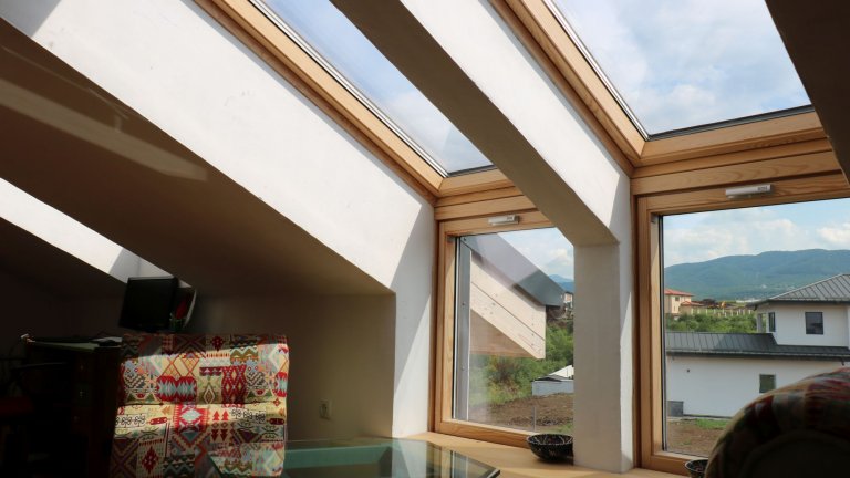 А през най-горещите дни на годината естественото проветрение, постигано благодарение на подходящото разположение на прозорците, включително покривните, създава прохлада и комфорт. "Това ни спасява дори и в най-жарките летни дни", споделя семейството. Освен ролетни щори, собствениците са решили да закупят и външни сенници, с които да поддържат идеалната температура у дома.