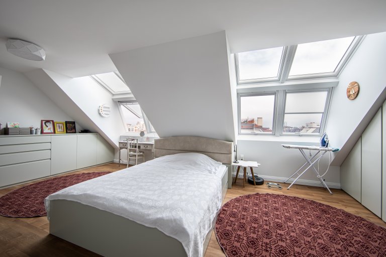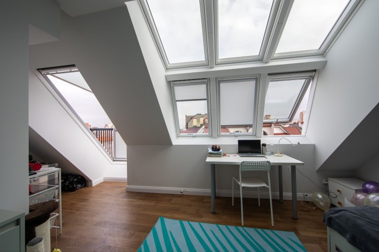 В мансардата са вградени почти всички покривни прозорци от портфолиото на VELUX. Те са разположени във всички помещения в апартамента и превръщат първоначалното мрачното подпокривно пространство в светъл и модерен дом.