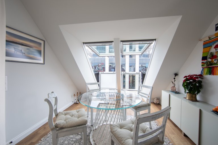 "Още когато видях двете малки ателиета ми хрумна, че могат да се обединят в един голям и светъл мансарден апартамент с 360-градусова панорамна гледка. В строежа на сградата беше заложено монтиране на вертикални прозорци, което не съвпадаше с моето виждане. За мен беше изключително важно подпокривното пространство да бъде проектирано, така че да се поставят покривни прозорци. В стария ни апартамент например, имаше общо 16 прозореца VELUX, които пропускаха слънчевите лъчи през по-голямата част от деня и създаваха отпускаща и ведра атмосфера у дома.", казва собственичката.
