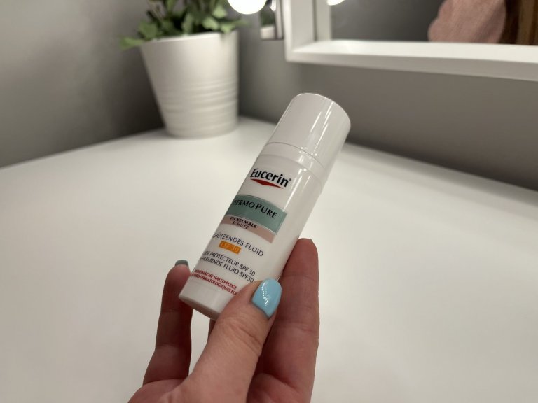 Когато лицето е в период на проблемно състояние, е много важно да го защитим от UV лъченията, за да не пигментира в местата, на които има пъпки или ранички. Затова Женя препоръчва като трета стъпка от дневната рутина Eucerin DermoPure Защитаващ флуид SPF30. Освен, че предпазва кожата от потъмняване, той се грижи за облекчаване на раздразнения по нея. При бързо омазняващи се кожи усещането за сухота през целия ден е търсено, а този флуид осигурява матиран завършек.