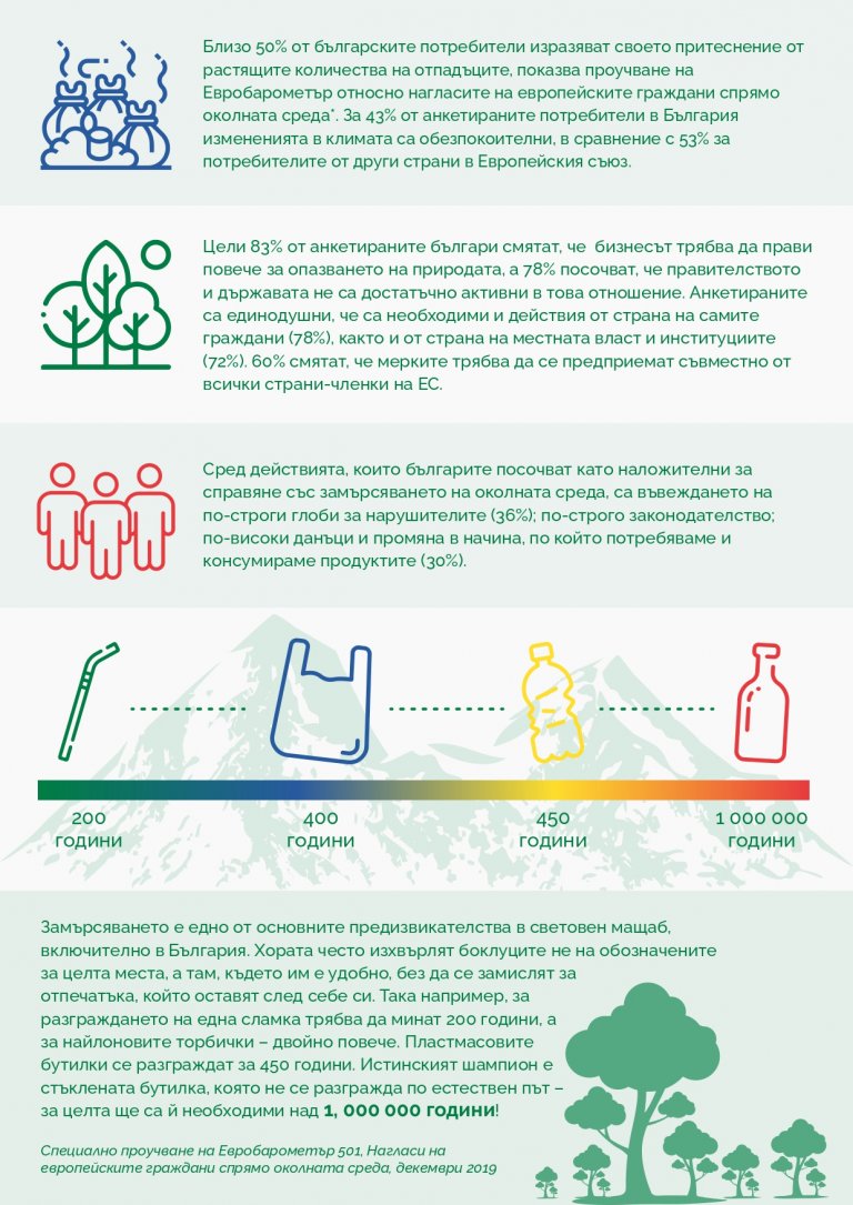 Тази тенденция е в унисон с нарастващото безпокойство относно климатичните промени и нивата на замърсяване в редица европейски страни. Така например, близо 50% от българските потребители изразяват своето притеснение от растящите количества на отпадъците, показва проучване на Евробарометър относно нагласите на европейските граждани спрямо околната среда*.