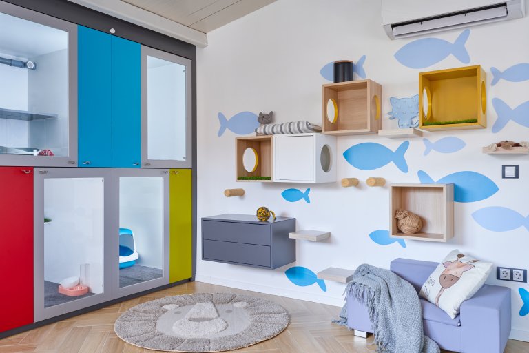 Освен класически хотел за кучета с място за до 10 едри или средни и 10 малки породи, има и зала с капацитет за до 8 домашни котки.