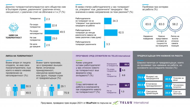 Толерантността към "различните хора" на национално ниво все още не е толкова широко застъпена - само 2,3% смятат, че българите сме изключително толерантни, докато 49,5% твърдят, че обществото спада в графа "по-скоро нетолерантни". Що се отнася до усещането колко толерантни са работодателите у нас, 34% споделят виждането, че те не са "отворени" към различията в кандидатите за работа.