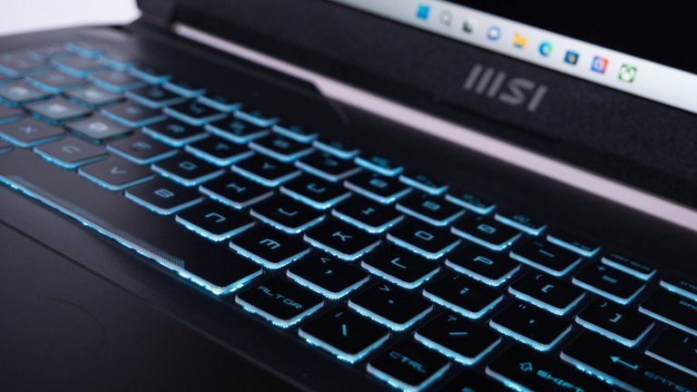 Клавиатурата на MSI Cyborg 15 е приятна. Клавишите не са твърде меки, а ходът им е приличен. Полупрозрачните WASD бутони, клавишът интервал, бутонът за включване и тези със стрелките определено изпъкват и това е удобно.