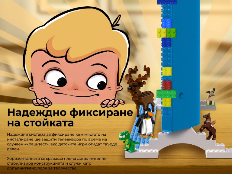 Новият продукт идва с набор от двустранни стикери, така че родителите да могат да закрепят телевизора по-сигурно на мястото, което са избрали.