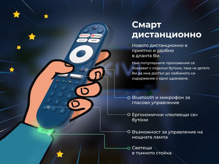 Актуализираното дистанционно управление на KIVI има ергономичен дизайн с минимум на брой бутони, така че дори дете да може да се справи с управлението на смарт телевизора. Приляга добре и удобно в дланта на ръката ви, а копчетата са плавни и тихи.