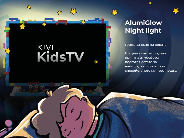 На гърба на KIVI KidsTV има нощна лампа AlumiGlow, която излъчва мека, успокояваща светлина. Тя създава уютна атмосфера в детското пространство и помага на децата да заспят по-бързо, особено ако не обичат да спят на тъмно. Нощната лампа може да работи дори когато телевизорът е изключен.