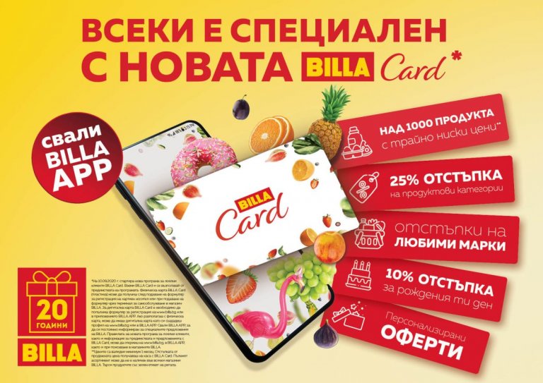 Целта на веригата е да е по-близо до потребителите, а новата BILLA Card постига това не само с дигитализирането си, но и с индивидуалните предложения, които ще предоставя. Ако вече имате стара BILLA Card, имайте предвид, че ще е валидна до 10 март 2021 г., но с доскорошните отстъпки. А сме сигурни, че искате - и заслужавате - всички нови предложения.