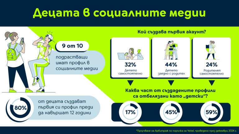 Колко често новорегистрираните профили се маркират като "детски"? Близо 1/3 от участниците в проучването на Yettel (между 7 и 19 г.) посочват, че са създали първия си профил самостоятелно. В тези случаи едва 17% от новорегистрираните акаунти са отбелязани като "детски" или "тийнейджърски". Във втория сценарий 44% от децата създават профилите си заедно с родител или друг възрастен. Тогава почти половината от акаунтите са съобразени с възрастта на детето.