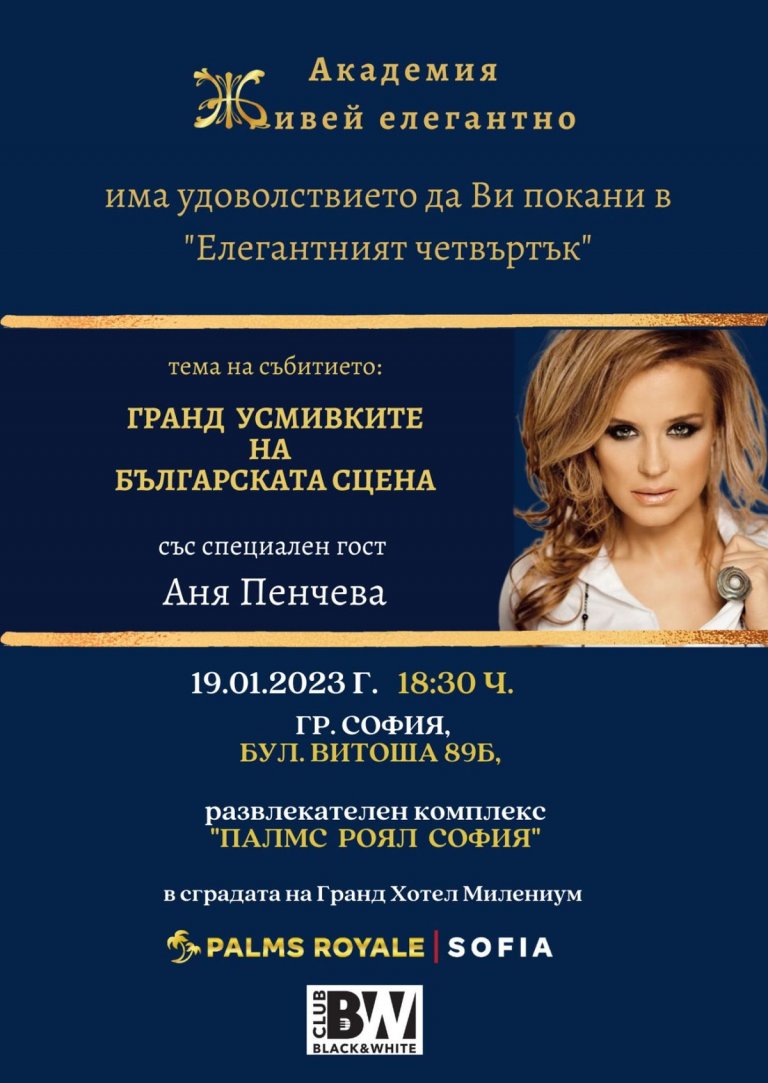 Предстоящият сезон на "Елегантния четвъртък" ще е под наслов "Гранд усмивките на българската сцена". По време на него Академията ще организира открити срещи със забележителни фигури от българския културен живот. Този четвъртък носителката на "Аскеер" ще разкаже за събитията, хората и ролите, които са я накарали да се усмихва през годините. Звездата ще разкрие случки с други български знаменитости, за които никога преди не е говорила. След официалната част участничките ще получат възможността да зададат своите въпроси и да се снимат с Аня Пенчева.