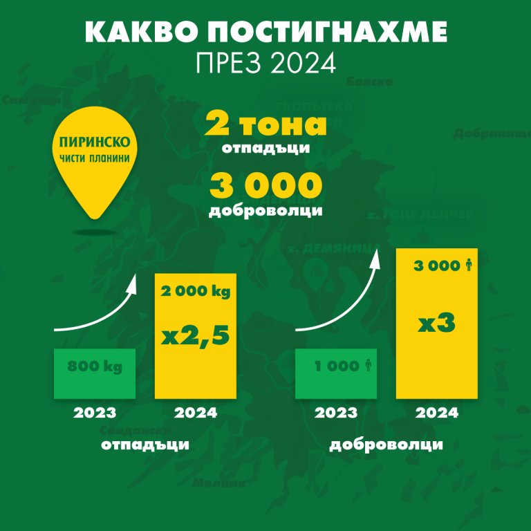 През 2024 г. над 3000 доброволци от цялата страна се включиха в 10 акции за почистването на Пирин, като събраха повече от 2 тона боклук на 6 различни локации в планината. Резултатите говорят сами за себе си: два пъти повече събрани отпадъци и тройно повече участници в сравнение с пилотното издание през 2023 г.