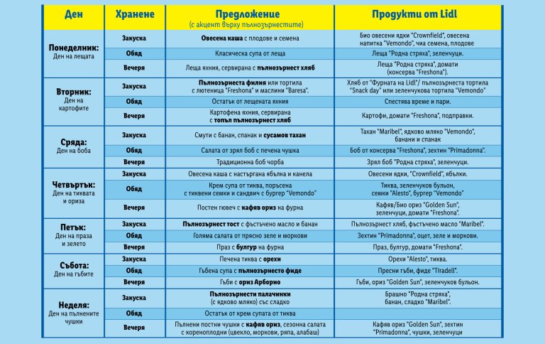 Заедно с Lidl и проф. Найденова създадохме примерен седмичен план за разнообразно хранене, който съчетава спазването на постите с грижата за здравето и разумното пазаруване: