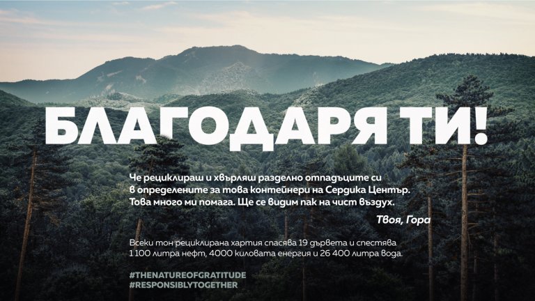 Рециклиране, пестене на природни ресурси и кръгова икономика са само част от действията, които можем да предприемем както индивидуално, така и колективно, за да опазим природата. С тази нагласа Сердика Център стартира и своята кампания Nature of Gratitude.