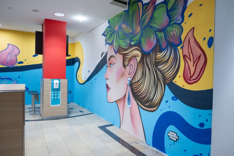 Преградни стени с площ близо 150 кв.м, ограждащи ремонтните дейности, бяха изрисувани с графит от артистите на Sofia Graffiti Tour. Творбата носи името "Нова Сердика" и символизира новото начало, препращайки към историческите корени на София и идеята за форум - място за срещи и общуване. В центъра на художествената интерпретация е образът на жена - Сердика, символ на града и неговите реки.