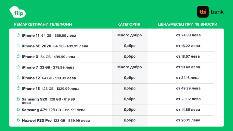 От flip.bg вярват, че в настоящата несигурна глобална икономическа ситуация наличието на надежден и доверен финансов партньор като tbi е решаваща част от целта да се предоставят проверени и перфектно работещи нови телефони.