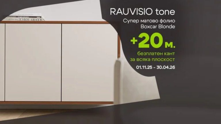 А с текущата оферта на GStroy - RAUVISIO tone Boxcar Blonde + 20 м безплатен кант за всяка плоскост - за мебелисти и интериорни дизайнери е още по-лесно да интегрират този тренд в следващите си проекти.