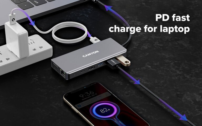 Комплекта от зареждащи устройства се завършва от адаптерът H-100 на Canyon, който принадлежи към новия тип зарядни устройства GaN, конструиран с използване на полупроводници на базата на галиев нитрид. Този материал позволява да се увеличи мощността на зарядното устройство без това да се отрази на неговите габарити.