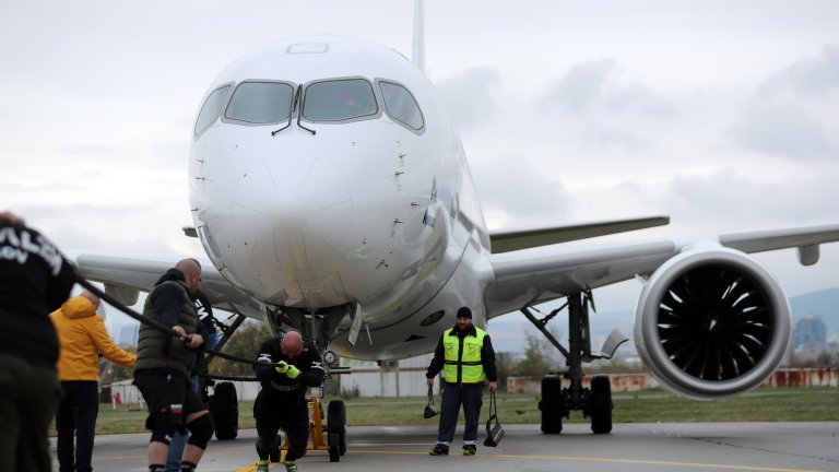 Двама от най-силните мъже в страната - Христо Мусков и Велизар Митов един по един направиха впечатляваща демонстрация за изтегляне на най-новия тип самолет във флота на националния авиопревозвач "България Еър" - Airbus A220-300.