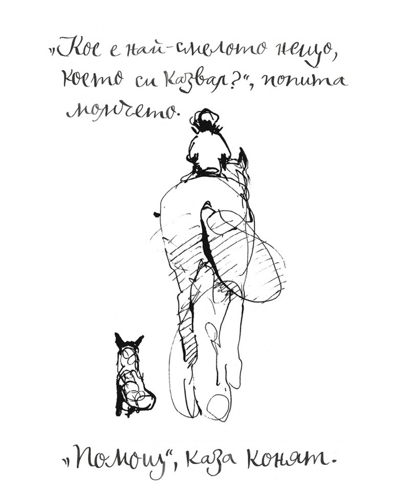 Това е само един от кратките, на пръв поглед семпли, но изпълнени със смисъл разговори, които редом с красиви илюстрации изпълват страниците на "Момчето, къртицата, лисицата и конят".