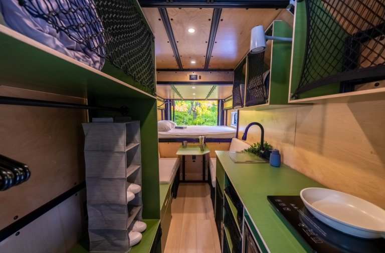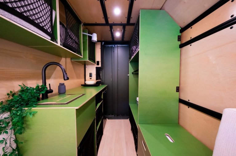 Има хладилник с фризер, индукционен плот, вградена фурна и килер за съхранение на хранителните продукти. Всичко това е отделено от мястото за водача с врата, за да може той да кара, без да го обезпокояват останалите пътници.