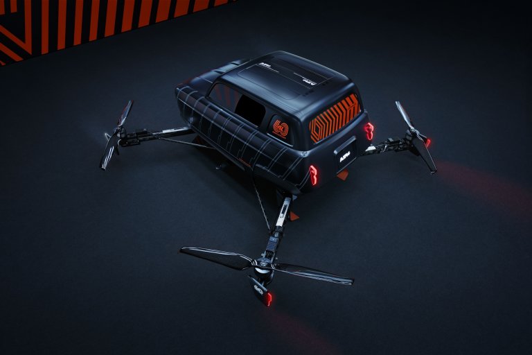 Renault AIR4 всъщност е голям дрон, способен да превозва човек. Вместо гуми летящата кола има четири перки и се задвижва не с традиционно гориво, а с батерии.