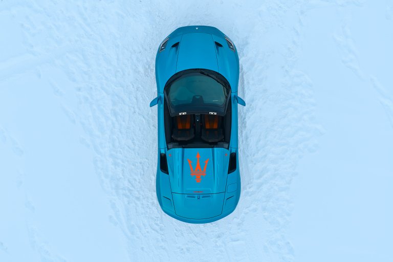 Оранжевата ливрея Dreamline, оранжевият Тризъбец върху капака на двигателя, външните емблеми, надписът Maserati и обозначението Cielo се превръщат в смели, ясно разпознаваеми графични елементи, създадени да се открояват на фона на снежния пейзаж.