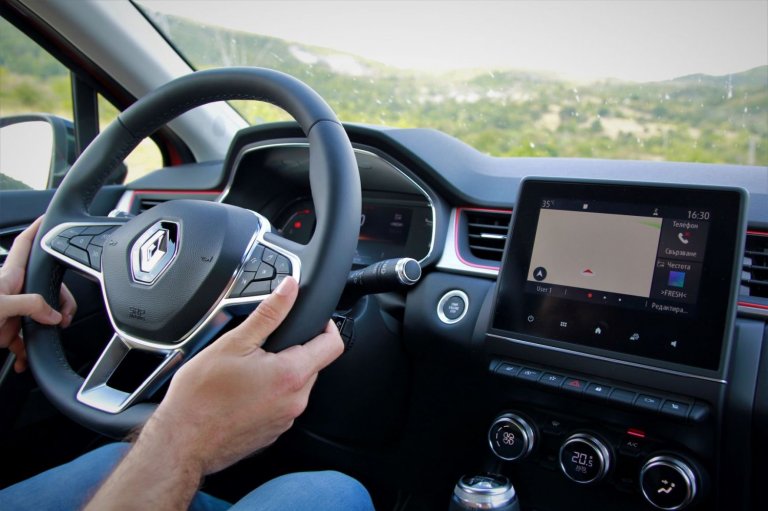 Как обаче изглежда животът зад волана? Captur е превъзходен на дълъг път. Активирате асистента за поддържане на линията, задавате скорост на автопилота и след това се наслаждавате на пейзажа през огромното предно стъкло.