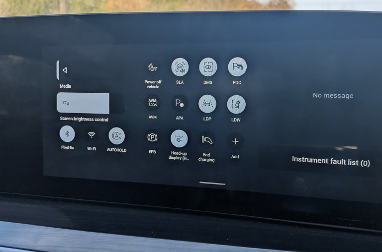Поддържа Android Auto и Apple CarPlay, разполага с огромен брой възможности за контрол, както и с адски удобно падащо меню, като при мобилните телефони, за включване и изключване на разни функции и асистенти.