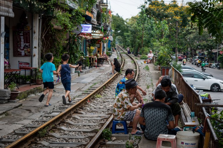 На ханойци не им прави никакво впечатление, че буквално на две крачки от входните врати, прозорците и терасите има функциониращи релси.