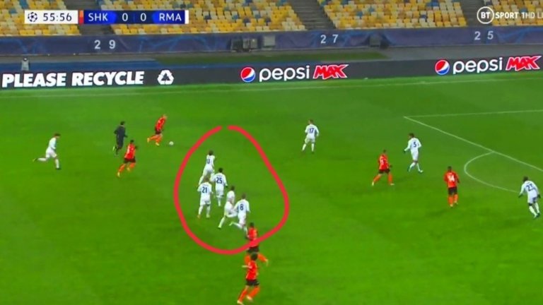 Преди гафа в защита обаче, камерите уловиха колко зле беше подреден Реал при прехода от атака в защита и колко беше неподготвен да противодейства на контраакцията на противника. В един момент цели петима играчи на гостите се бяха събрали в една редичка в центъра, безнадеждно далеч от който и да е футболист на Шахтьор.