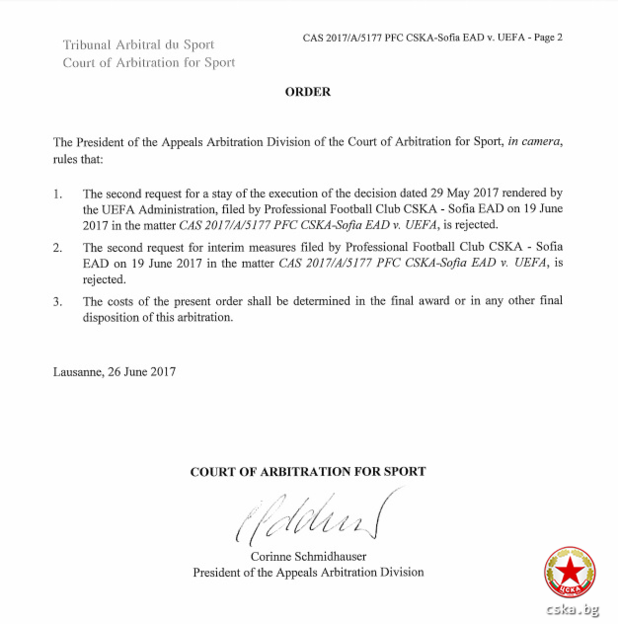 1. Второто искане за спиране на изпълнението на решението на администрацията на УЕФА от 29 май 2017 г., което е заведено от ПФК ЦСКА-София ЕАД на 19 юни 2017 г. по делото CAS2017/A/5177 ПФК ЦСКА-София ЕАД срещу УЕФА, е отхвърлено.