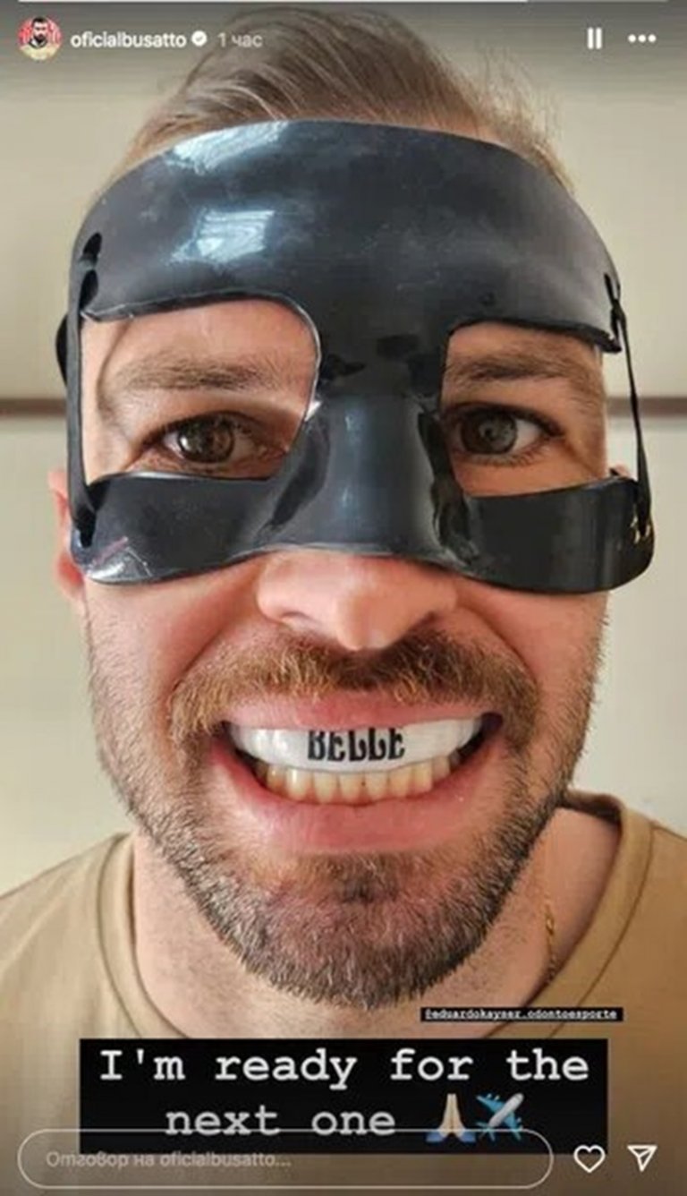 Бусато пусна снимки в социалните мрежи, в които е с гума за уста и предпазна маска, но демонстрира оптимизъм и написа: "Готов съм за следващия."