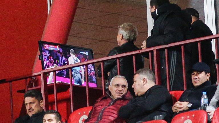 Собственикът на ЦСКА Гриша Ганчев изгледа победата с 1:0 над Берое от трибуните на "Българска армия" в компанията на колегата си в ръководството на клуба Христо Стоичков.
