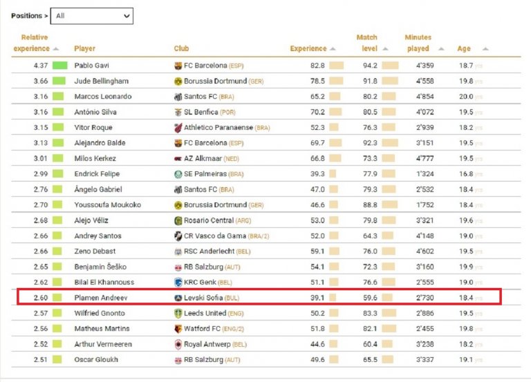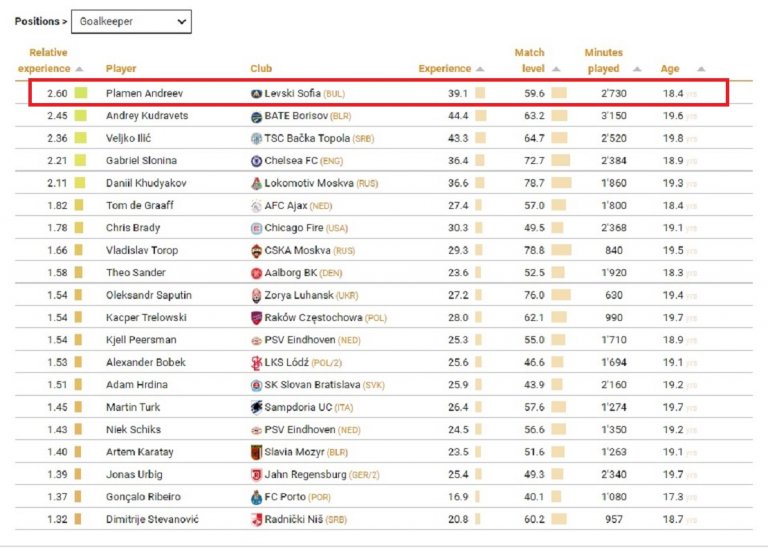 18-годишният Андреев събира коефициент от 2,60, което го нарежда под №1 сред вратарите и под №16 сред всички футболисти под 20 г.
