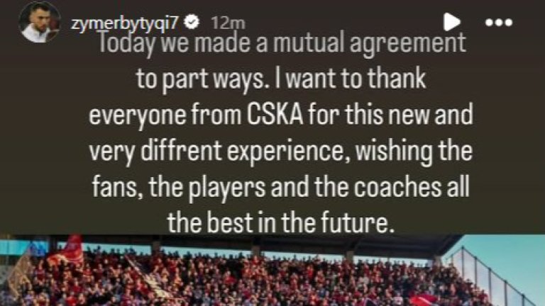 "Офанзивният футболист Зюмюр Бютучи вече не е част от състава на ЦСКА. Днес клубът и играча прекратиха договорните си отношения по взаимно съгласие.