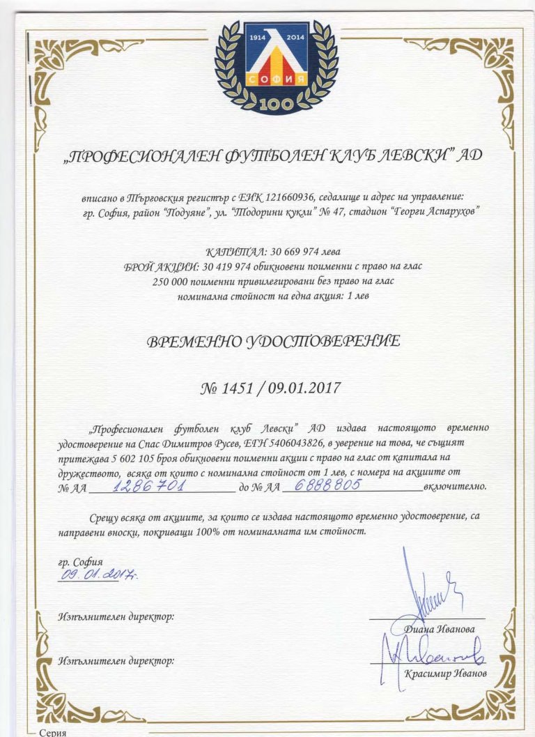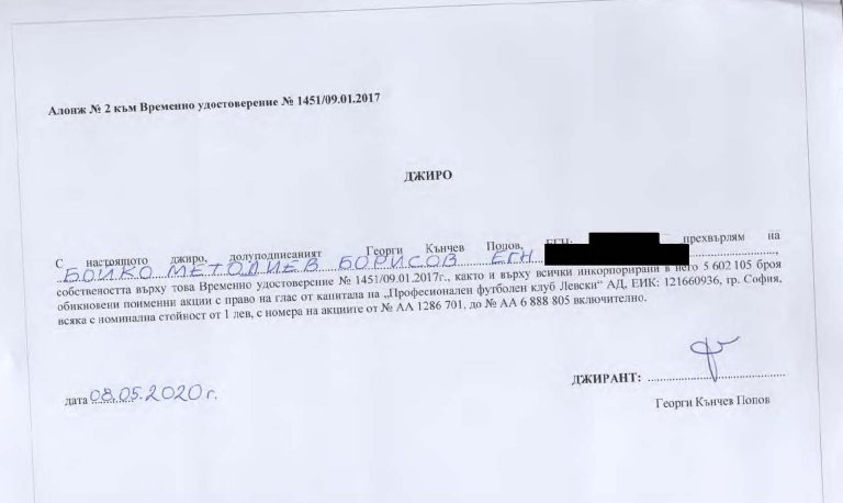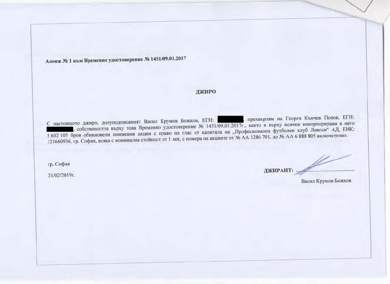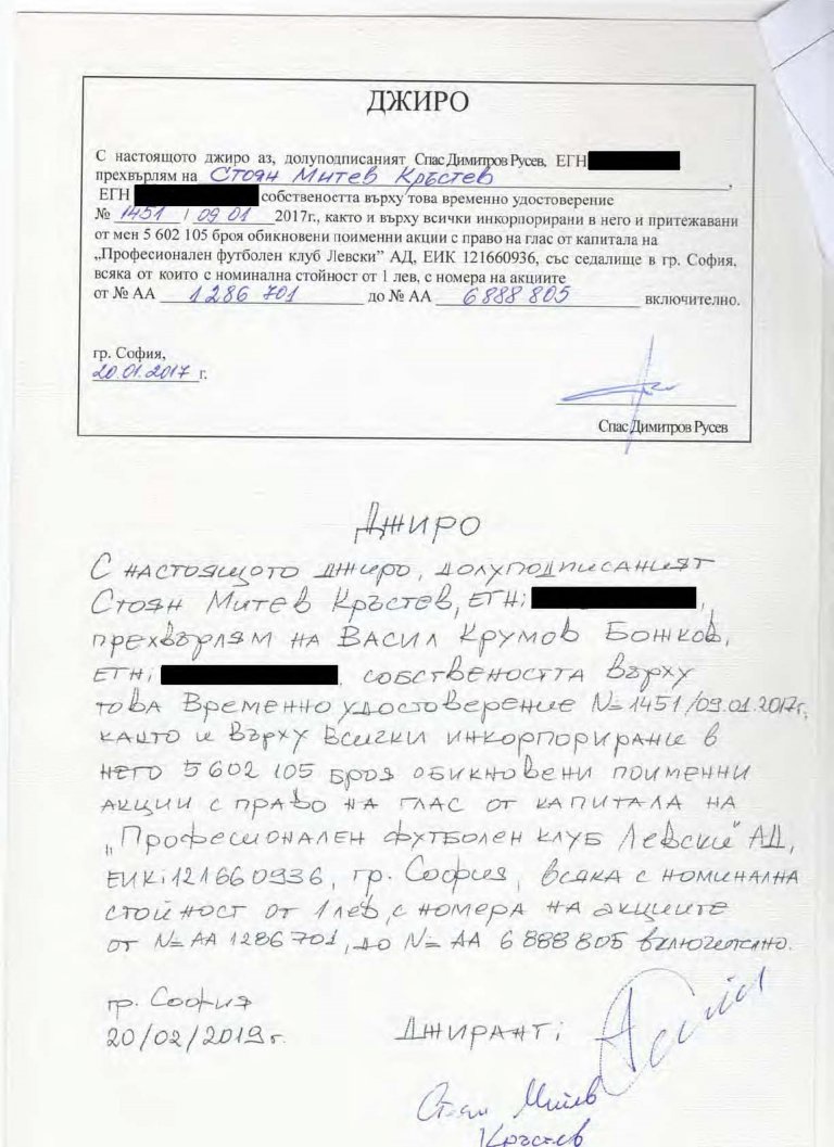 Затова прехвърляме акциите на отговорника за погубването на "Левски", който неведнъж е заявявал своята готовност да се "погрижи" за отбора и да го спаси при смяна на собствеността му - г-н Бойко Борисов.