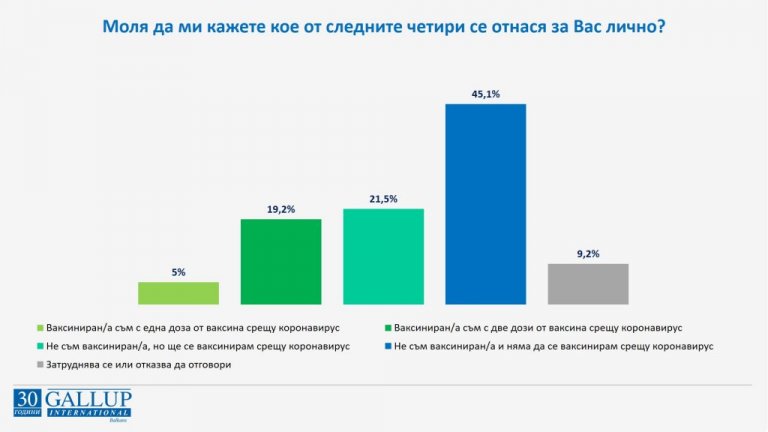 19 на сто от запитаните казват, че вече са напълно ваксинирани. Друга една пета - 21.5%, заявяват, че още не са, ще го направят. 45% обаче отговарят, че нито са се ваксинирали, нито възнамеряват да го направят. Цели 9 на сто не отговарят на въпроса дали са ваксинирани и дали смятат да се го направят или не.
