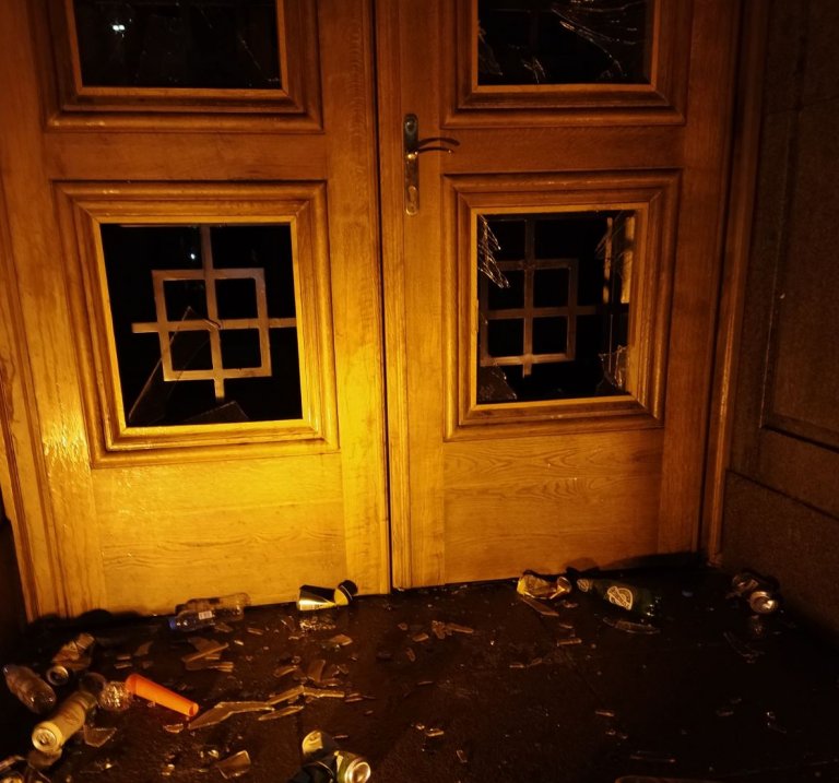 Стъклени бутилки също са били хвърляни по полицаите и сградата. Това е довело до счупване на вратата на бившия Партиен дом. Стигнало се е и до опит за нахлуване вътре.